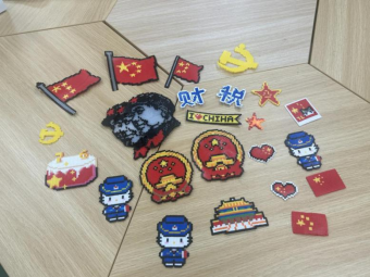 活动期间,同学们共完成数十件红色主题拼豆作品,品类丰富且细节精致:有象征国家尊严的国徽,红底之上金黄的齿轮与麦穗纹路生动还原;有展现伟人风采的毛主席画像,通过精准的豆粒排布还原出清晰轮廓;有凸显建筑庄重的天安门图案,屋檐层次与整体结构经细致拼合尽显规整;还有党徽、五星红旗等经典红色元素作品,红金配色鲜明,图案辨识度高。这些作品铺满活动桌面,同学们在创作间隙驻足欣赏,相互交流拼合技巧与设计思路,成果直观展现了活动的红色主题内核。