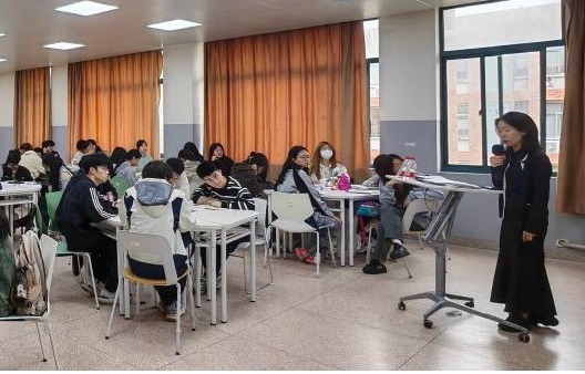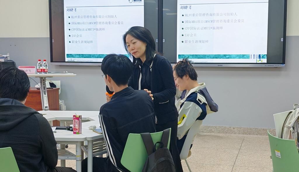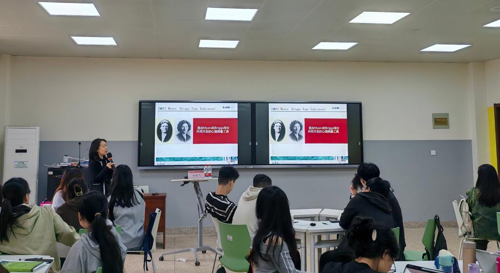 讲座开始前,刘央央老师为主讲嘉宾刘晓飞老师做了简要介绍,刘老师通过设想五年后的同学聚会场景,鼓励大家与周围的同学进行握手互动,以此活跃了班级氛围。随后,刘老师深入探讨了“领导力”的内涵,并着重强调了自我认知的重要性。她详细阐述了MBTI的四个维度,包括两个功能对和两个态度对,并通过这些维度引出心理活动的四个方面——心理能量、信息采集、判断决策和环境安排,以及与之对应的八个方向——外向、内向、实感、直觉、理性、感性、趋定、顺变。接着刘老师以八个方向为核心,分析了几个典型案例,引导学生们识别自己的心理偏好,并巧妙地运用问题,如“想到大海的第一反应是什么”,来帮助学生们更好地理解自己的心理倾向。