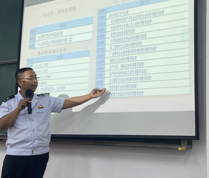 黄健老师从企业所得税为大切口进行解读,分享内容主要分为以下几方面:一是企业所得税月(季)预缴纳税申报表具体阐述了企业所得税申报事项目录,适用核定征收企业所得税的几种情形等;二是报表体系特点有层级性和选择性;三是企业的申报表基础信息表;四是纳税调整项目明细表。通过对企业所得税的解读让同学们了解国家目前对企业征税政策,体现国家税收政策对市场主体的促进作用。