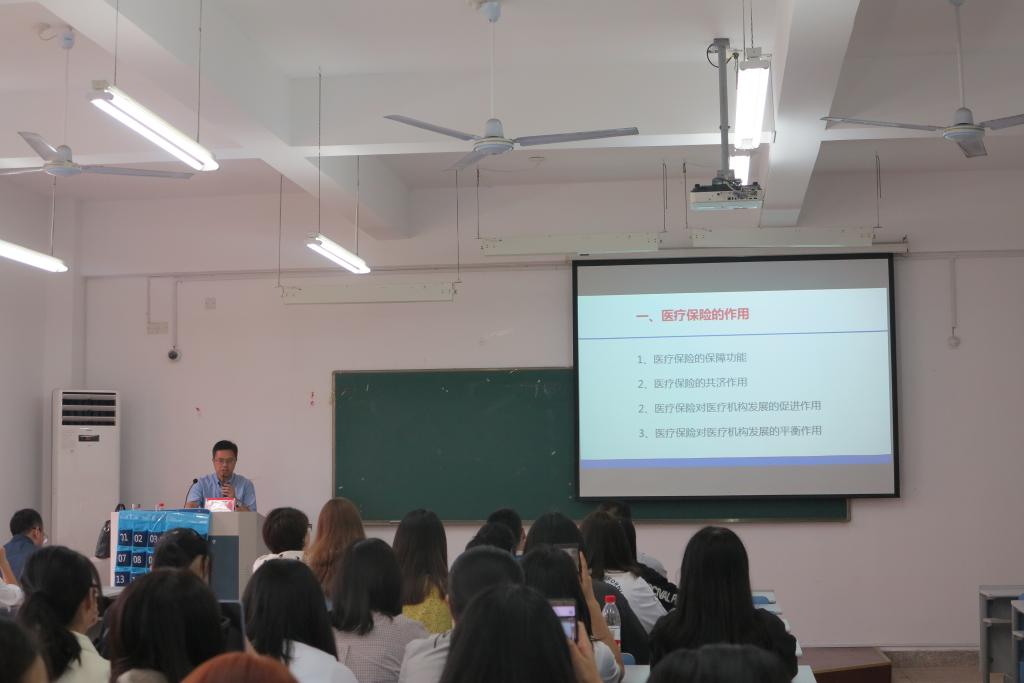 2019年10月8日下午财税大讲坛迎来了本学期的第一场讲座。本次讲座的主讲嘉宾是 海宁医保局副局长曹立健,学分院刘颖副院长、社会保障专业老师和16社保、17级税收等60余人参加。