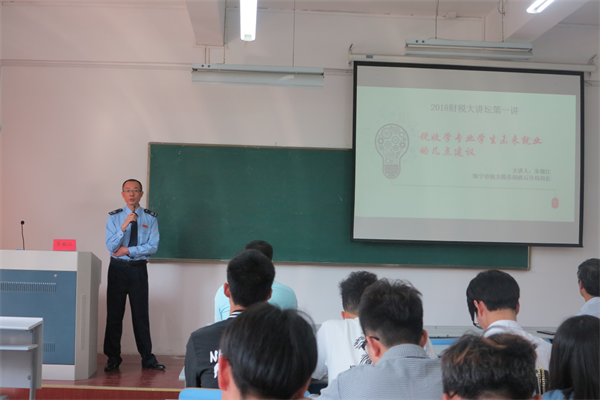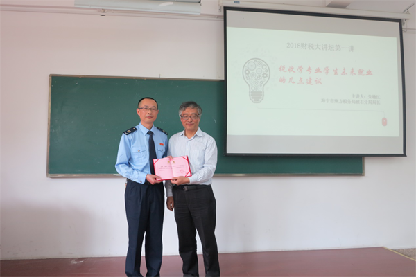 4月20日下午2018财税大讲坛迎来了第一场讲座。讲座邀请到海宁市地方税务局硖石分局局长朱敏江作为主讲人,税务系王绪强副教授、朱计老师及15级税收学专业50余人参加。