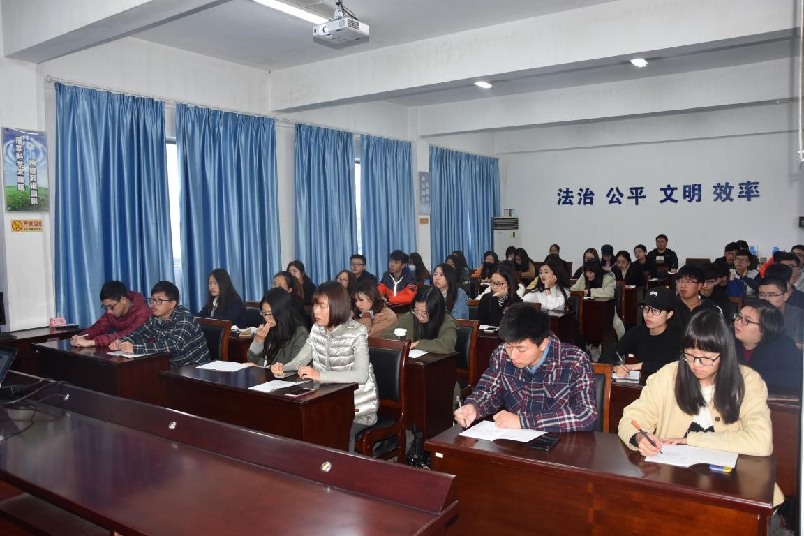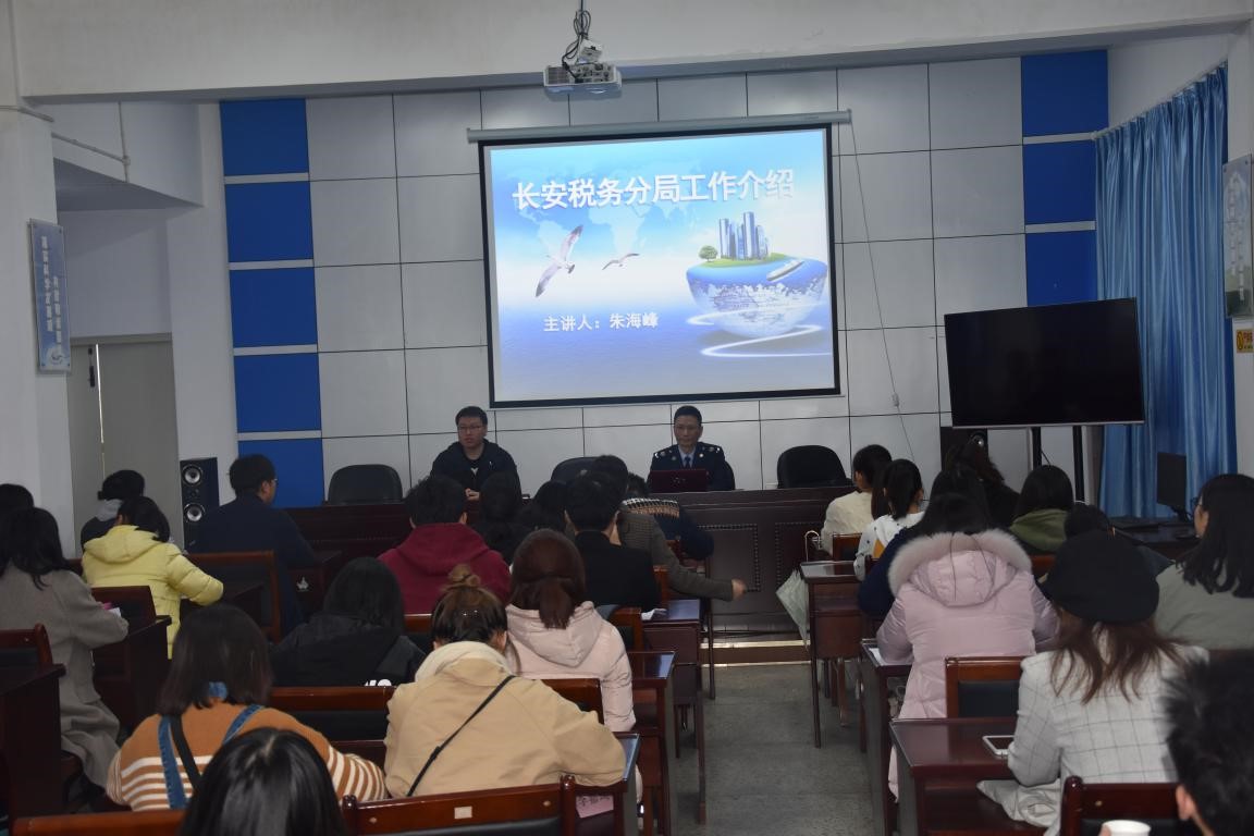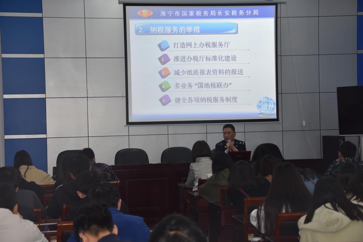 11月21日上午,我院2015级财政学专业近100名同学在《税务管理》课程任课老师的组织下,前往海宁市国家税务局长安税务分局,在四楼会议室进行该课程实践内容的学习,长安分局申报征收股朱海峰股长担任此次实践课的主讲老师。