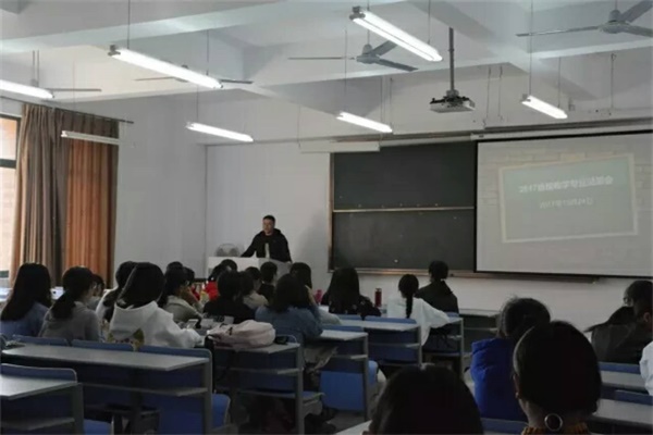 随后,朱老师系统地介绍了17级税收专业学生的教育方向和未来学业规划。税收专业的方向主要分为三个,分别是税务师方向、国际税收方向以及税务管理方向。在实践应用方面,学校为同学们提供了相对稳定的校外实习基地,也希望在未来可以实现双导师教学,校内外各一位导师,更全面地指导学生发展。在介绍税收系毕业生就业去向时,通过对往届毕业生的就业去向进行统计分析,让同学们更加直观地了解到税收系学生的就业方向。在会议结尾,朱计老师表达了对所有新生的期望,希望每一个学生都可以做到内外兼修,学会团队协作,拥有国际视野,进行实践创新。