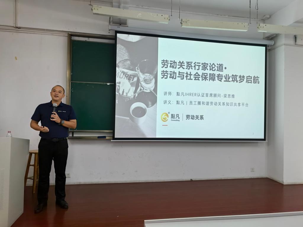 为深化劳动与社会保障专业学生对劳动关系课程的理解与掌握,2025年10月14日下午,我院特邀梁思维老师担任主讲嘉宾,在6J105教室举办了主题为“劳动关系行家论道·劳动与社会保障专业筑梦启航”的专业讲座。本次讲座由夏磊老师主持,劳动与社会保障专业全体同学共同参与。梁思维老师是点凡劳动关系研究院院长,兼任中国劳动学会理事、国家劳动人事争议仲裁员以及广东劳动学会监事。他长期深耕劳动争议研究与咨询领域,并为多家大型企业提供专业的劳动法律顾问服务,在劳动关系管理方面拥有深厚的理论功底和丰富的实战经验。