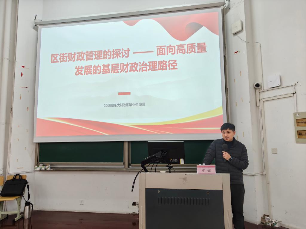 为了搭建理论与基层实践衔接的桥梁巩固学生《财政学》课程的相关专业知识,2025年12月16日下午,我院诚挚邀请上城区四季青街道社区治理服务中心副主任章耀先生担任主讲嘉宾,在4J101教室举办了主题为“区街财政管理的探讨”的专业讲座。本次讲座由陈祥槐老师主持,24级财政学和24级税收学全体同学共同参加。