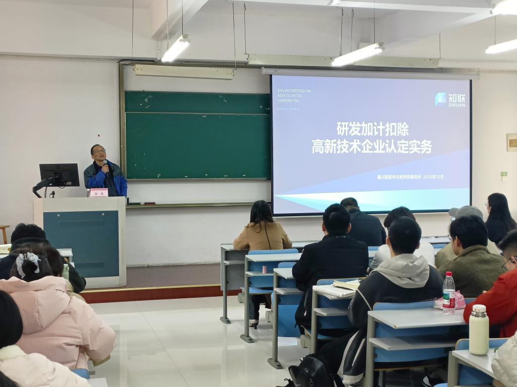 2025年12月16日下午,我院邀请嘉兴知联中佳税务师事务所有限公司副总经理孙浩,于6教205做主题为“研发加计扣除与高新技术企业认定实务”的专题讲座,《中国税制》4学分课程授课教师及24级税收班120余位同学参加了本次活动。