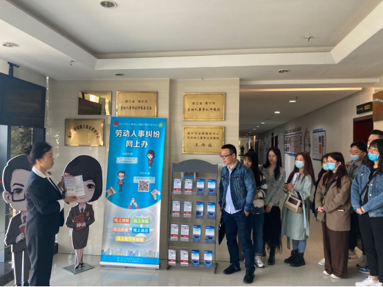 海宁市劳动人事争议仲裁庭庭审观摩实训内容为劳动仲裁理论与实务,本次庭审观摩由参观劳动仲裁文化长廊、庭审观摩、互动提问三个环节构成,促进了学生对仲裁文化的学习、庭审流程的了解以及专业知识的深度学习。