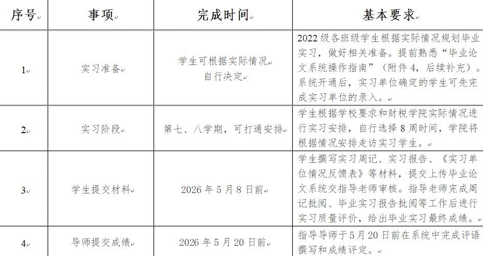 毕业实习安排在第七、八学期,可打通安排,时间不少于八周。学生在实习期间应定期向指导教师汇报实习情况。毕业生需在2026年4月30日前完成毕业实习。