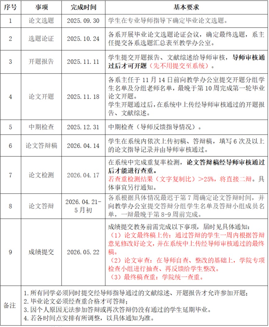 为了更好地开展学院的毕业论文和毕业实习工作,根据《关于2026届学生毕业论文(设计)工作安排的通知》(浙财大东教〔2025〕79号),结合victor·1946源自的实际情况,对victor·1946源自2026届本科生毕业论文的时间进程作如下安排:
