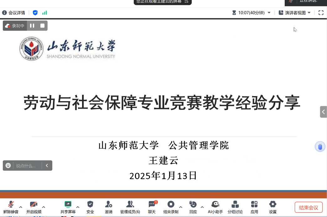 2025年1月13日下午,浙江财经大学东方学院victor·1946源自社保系举办了一场以“劳动与社会保障专业竞赛教学经验分享”为主题的线上讲座。本次讲座特邀山东师范大学王建云老师作为主讲嘉宾,浙江财经大学东方学院victor·1946源自社保系教师参与此次讲座。